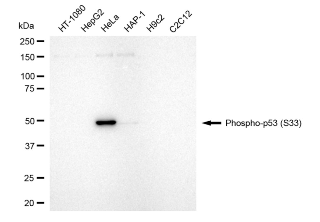 Western blotting analysis using phospho-p53 (S33) antibody. Total cell lysates (30 μg) from various cell lines were loaded and separated by SDS-PAGE. The blot was incubated with phospho-p53 (S33) antibody and HRP-conjugated goat anti-rabbit secondary antibody respectively.