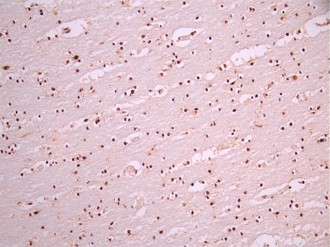 IHC image of CSB-RA982352A0HU diluted at 1:100 and staining in paraffin-embedded human brain tissue performed on a Leica BondTM system. After dewaxing and hydration, antigen retrieval was mediated by high pressure in a citrate buffer (pH 6.0). Section was blocked with 10% normal goat serum 30min at RT. Then primary antibody (1% BSA) was incubated at 4°C overnight. The primary is detected by a Goat anti-rabbit polymer IgG labeled by HRP and visualized using 0.05% DAB.