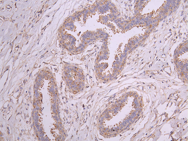 IHC image of CSB-RA008615MA1HU diluted at 1:200 and staining in paraffin-embedded human breast cancer performed on a Leica BondTM system. After dewaxing and hydration, antigen retrieval was mediated by high pressure in a citrate buffer (pH 6.0). Section was blocked with 10% normal goat serum 30min at RT. Then primary antibody (1% BSA) was incubated at 4°C overnight. The primary is detected by a Goat anti-human polymer IgG labeled by HRP and visualized using 0.05% DAB.