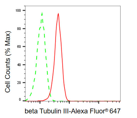 Flow cytometric analysis of beta Tubulin III expression in HT-1080 cells using beta Tubulin III antibody. Green, isotype control; red, beta Tubulin III.