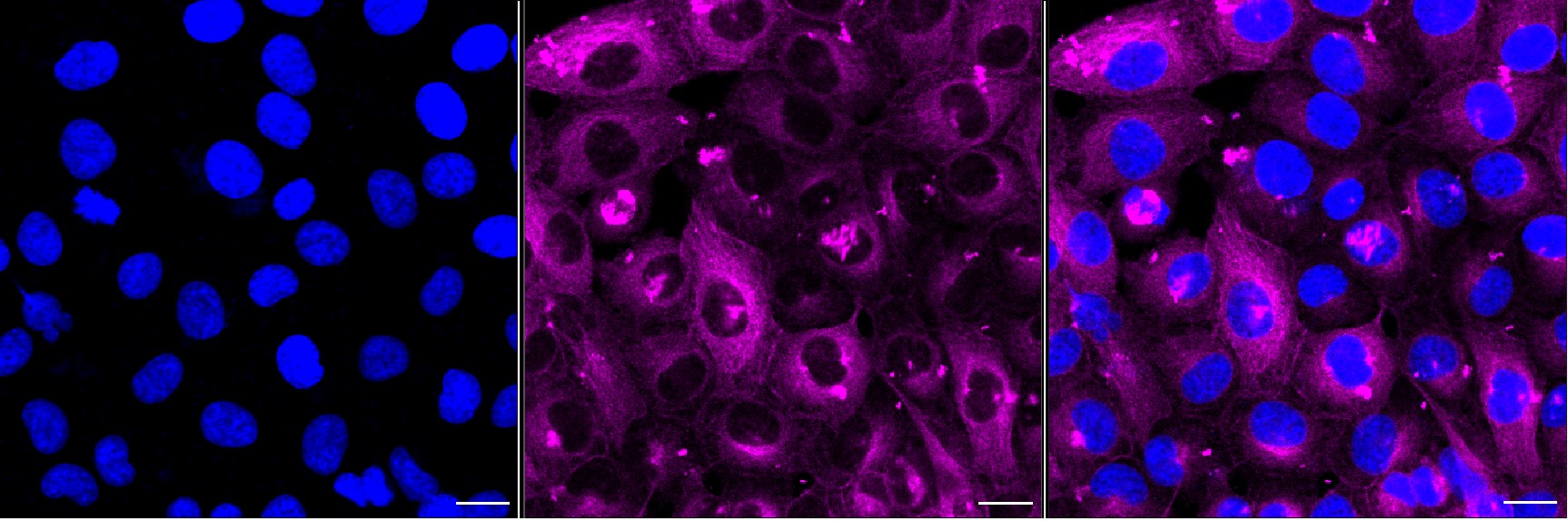 Immunocytochemical staining of HT-1080 cells with beta Tubulin III antibody. Nuclei were stained blue with DAPI; beta Tubulin III was stained magenta with Alexa Fluor? 647. Images were taken using Leica stellaris 5. Protein abundance based on laser Intensity and smart gain: Medium. Scale bar, 20 μm.