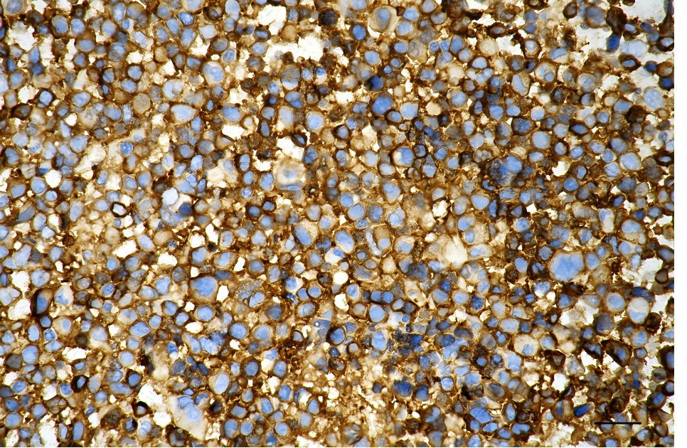 Immunohistochemistry was performed on paraffin-embedded human glioblastoma using tubulin III antibody. Antigen retrieval was done in sodium citrate buffer (pH 6.0). DAB was used for detection, with hematoxylin counterstaining. Images were acquired using a Nikon Ci-L Plus microscope (40× objective). Scale bar: 25 μm.