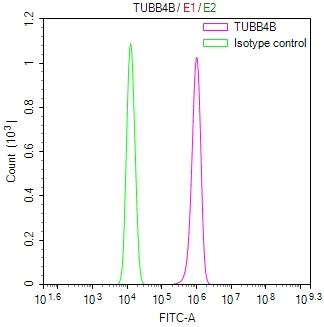 Overlay Peak curve showing Hela cells stained with CSB-RA130268A0HU (red line) at 1:100. The cells were fixed in 4% formaldehyde and permeated by 0.2% TritonX-100 for 10min. Then 10% normal goat serum to block non-specific protein-protein interactions followed by the antibody (1ug/1*106cells) for 45min at 4℃. The secondary antibody used was FITC-conjugated goat anti-rabbit IgG (H+L) at 1/200 dilution for 35min at 4℃.Control antibody (green line) was Rabbit IgG (1ug/1*106cells) used under the same conditions. Acquisition of >10,000 events was performed.