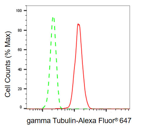 Flow cytometric analysis of gamma Tubulin expression in HepG2 cells using gamma Tubulin antibody. Green, isotype control; red, gamma Tubulin.