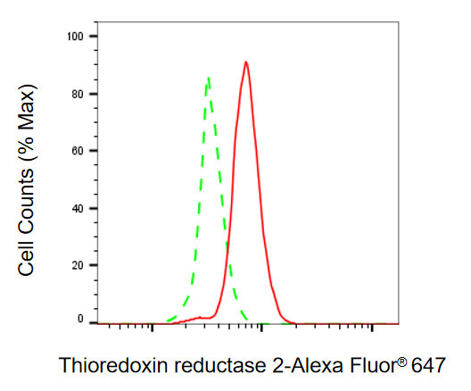 Flow cytometric analysis of thioredoxin reductase 2 expression in Hela cells using thioredoxin reductase 2 antibody. Green, isotype control; red, thioredoxin reductase 2.