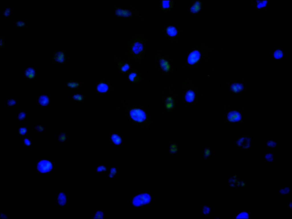 Immunofluorescence staining of A549 cell with CSB-RA266118A0HU at 1:50, counter-stained with DAPI. The cells were fixed in 4% formaldehyde, permeabilized using 0.2% Triton X-100 and blocked in 10% normal Goat Serum. The cells were then incubated with the antibody overnight at 4°C. The secondary antibody was Alexa Fluor 488-congugated AffiniPure Goat Anti-Rabbit IgG(H+L).
