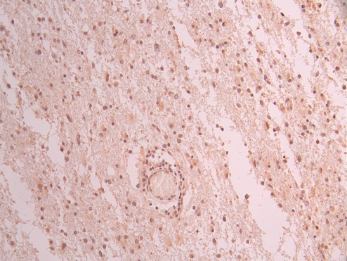 IHC image of CSB-RA266118A0HU diluted at 1:100 and staining in paraffin-embedded human glioma cancer performed on a Leica BondTM system. After dewaxing and hydration, antigen retrieval was mediated by high pressure in a citrate buffer (pH 6.0). Section was blocked with 10% normal goat serum 30min at RT. Then primary antibody (1% BSA) was incubated at 4°C overnight. The primary is detected by a Goat anti-rabbit polymer IgG labeled by HRP and visualized using 0.05% DAB.