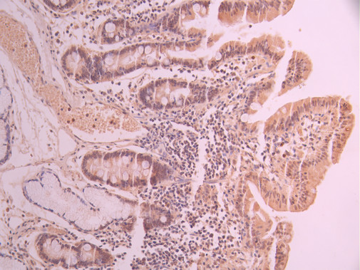 IHC image of CSB-RA266118A0HU diluted at 1:100 and staining in paraffin-embedded human small intestine tissue performed on a Leica BondTM system. After dewaxing and hydration, antigen retrieval was mediated by high pressure in a citrate buffer (pH 6.0). Section was blocked with 10% normal goat serum 30min at RT. Then primary antibody (1% BSA) was incubated at 4°C overnight. The primary is detected by a Goat anti-rabbit polymer IgG labeled by HRP and visualized using 0.05% DAB.