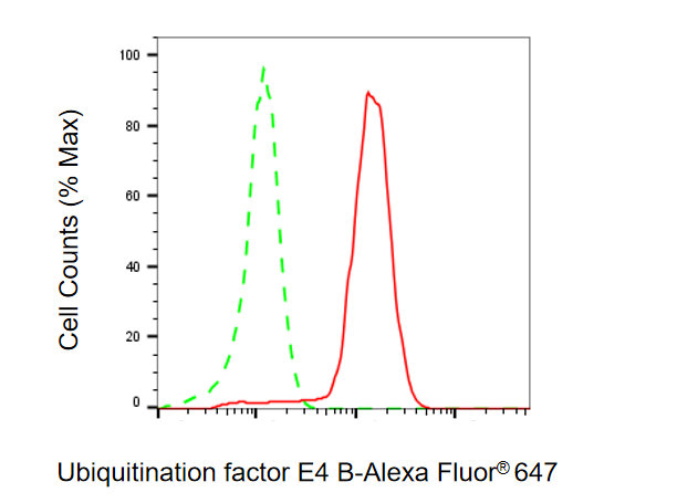 Flow cytometric analysis of Ubiquitination factor E4 B expression in HepG2 cells using Ubiquitination factor E4 B antibody. Green, isotype control; red, Ubiquitination factor E4 B.
