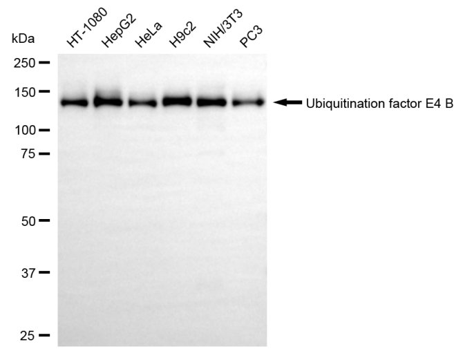 Western blotting analysis using ubiquitination factor E4 B antibody. Total cell lysates (30 μg) from various cell lines were loaded and separated by SDS-PAGE. The blot was incubated with ubiquitination factor E4 B antibody and HRP-conjugated goat anti-rabbit secondary antibody respectively.