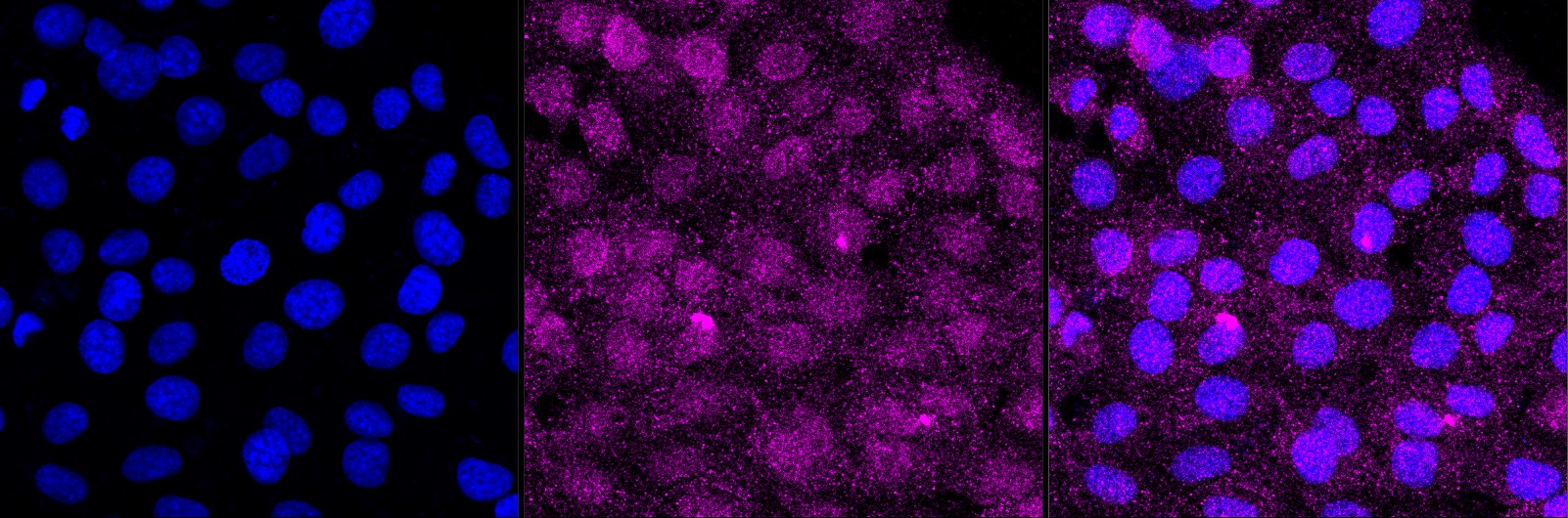 Immunocytochemical staining of HT-1080 cells with UBR5 antibody. Nuclei were stained blue with DAPI; UBR5 was stained magenta with Alexa Fluor? 647. Images were taken using Leica stellaris 5. Protein abundance based on laser Intensity and smart gain: Low. Scale bar, 20 μm.