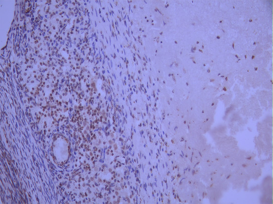 IHC image of CSB-RA981712A0HU diluted at 1:100 and staining in paraffin-embedded human ovarian cancer performed on a Leica BondTM system. After dewaxing and hydration, antigen retrieval was mediated by high pressure in a citrate buffer (pH 6.0). Section was blocked with 10% normal goat serum 30min at RT. Then primary antibody (1% BSA) was incubated at 4°C overnight. The primary is detected by a Goat anti-rabbit polymer IgG labeled by HRP and visualized using 0.05% DAB.