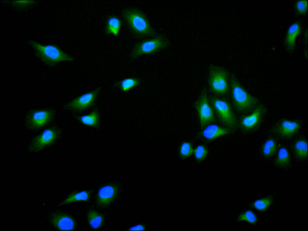 Immunofluorescence staining of HeLa cell with CSB-RA118372A0HU at 1:50 , counter-stained with DAPI. The cells were fixed in 4% formaldehyde, permeabilized using 0.2% Triton X-100 and blocked in 10% normal Goat Serum. The cells were then incubated with the antibody overnight at 4°C. The secondary antibody was Alexa Fluor 488-congugated AffiniPure Goat Anti-Rabbit IgG(H+L).