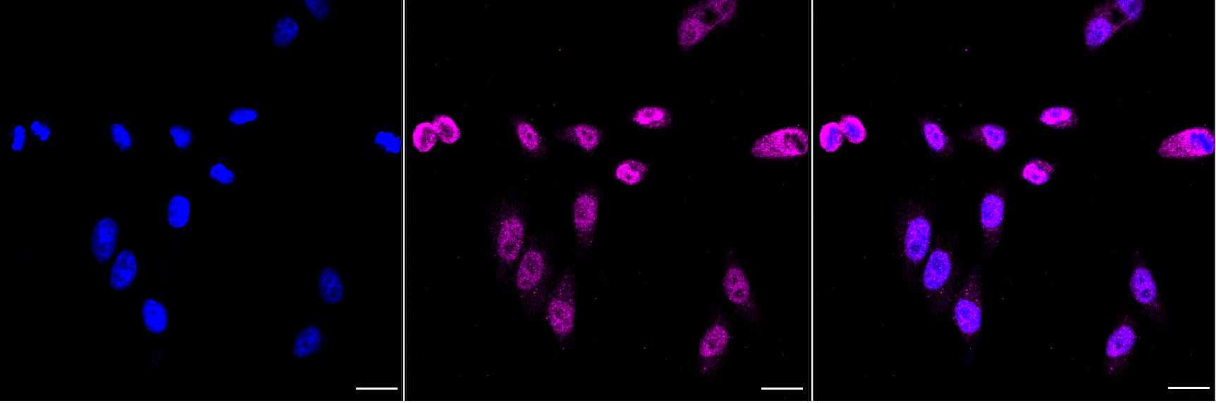 Immunocytochemical staining of HepG2 cells with Ubiquitin specific peptidase 7 antibody. Nuclei were stained blue with DAPI; Ubiquitin specific peptidase 7 was stained magenta with Alexa Fluor? 647. Images were taken using Leica stellaris 5. Protein abundance based on laser Intensity and smart gain: Medium. Scale bar, 20 μm.