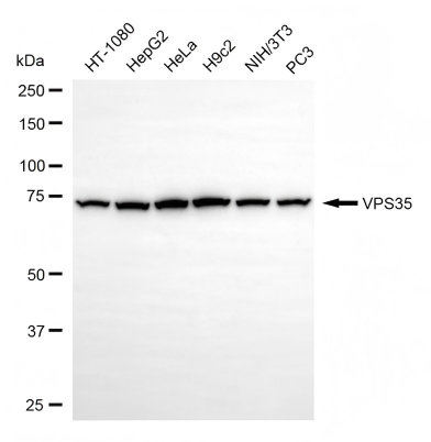 Western blotting analysis using VPS35 antibody. Total cell lysates (30 μg) from various cell lines were loaded and separated by SDS-PAGE. The blot was incubated with VPS35 antibody and HRP-conjugated goat anti-rabbit secondary antibody respectively.