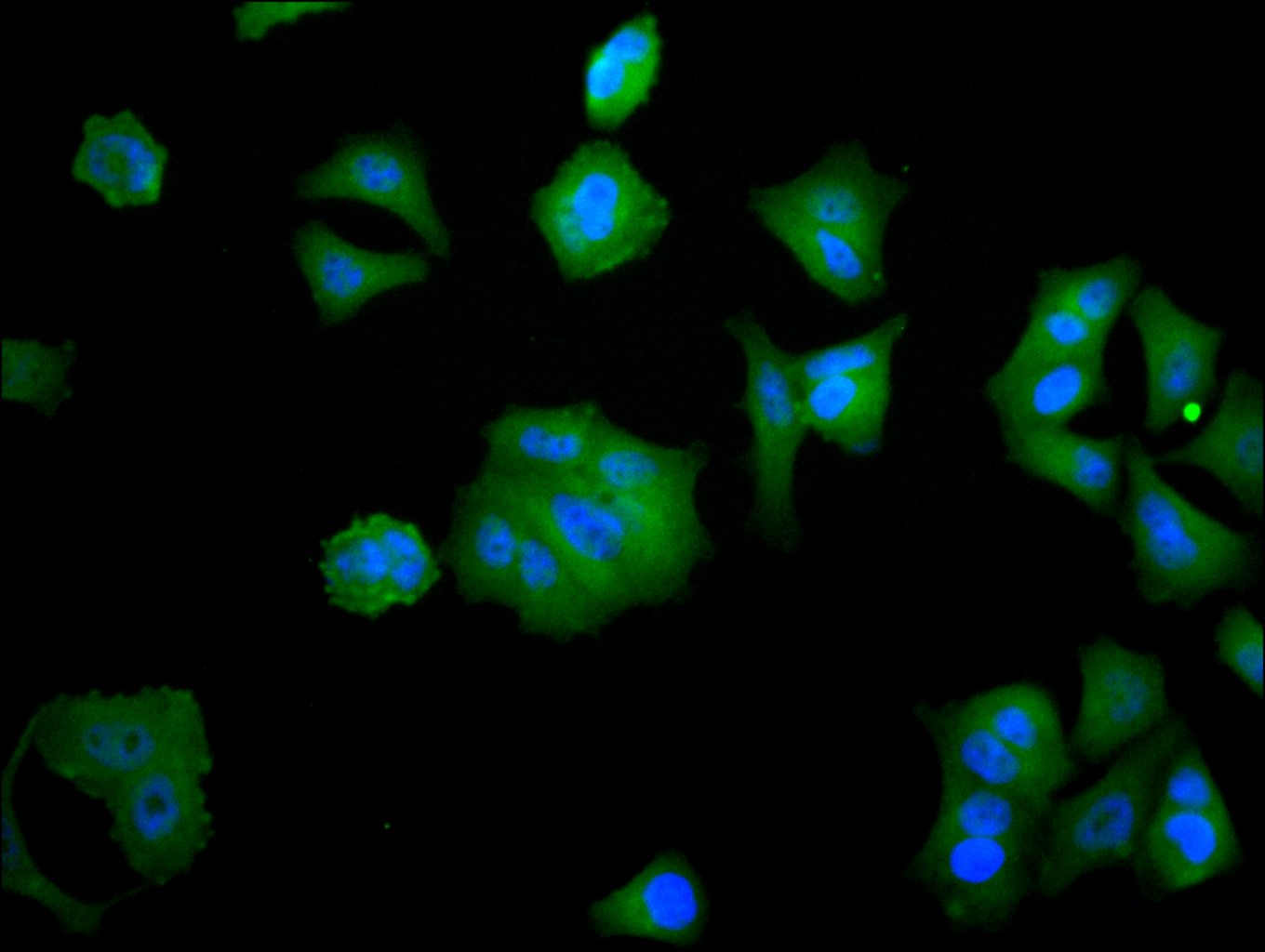 Immunofluorescence staining of Hela cell with CSB-RA026293MA1HU at 1:30 counter-stained with DAPI. The cells were fixed in 4% formaldehyde, permeabilized using 0.2% Triton X-100 and blocked in 10% normal Goat Serum. The cells were then incubated with the antibody overnight at 4°C. The secondary antibody was Alexa Fluor 488-congugated AffiniPure Goat Anti-Human IgG(H+L).
