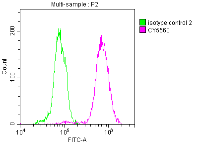 Overlay histogram showing Hela cells stained with CSB-RA712206A0HU (red line) at 1:50. The cells were fixed with 70% Ethylalcohol (18h) and then incubated in 10% normal goat serum to block non-specific protein-protein interactions followedby the antibody (1μg/1*106 cells) for 1 h at 4℃.The secondary antibody used was FITC-conjugated goat anti-rabbit IgG (H+L) at 1/200 dilution for 30min at 4℃. Control antibody (green line) was Rabbit IgG (1μg/1*106 cells) used under the same conditions. Acquisition of >10,000 events was performed.