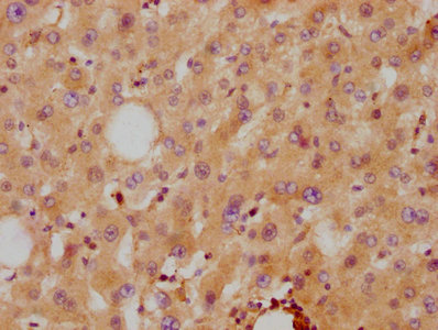 IHC image of CSB-RA001915A0HU diluted at 1:87.5 and staining in paraffin-embedded human liver tissue performed on a Leica BondTM system. After dewaxing and hydration, antigen retrieval was mediated by high pressure in a citrate buffer (pH 6.0). Section was blocked with 10% normal goat serum 30min at RT. Then primary antibody (1% BSA) was incubated at 4℃ overnight. The primary is detected by a biotinylated secondary antibody and visualized using an HRP conjugated SP system.