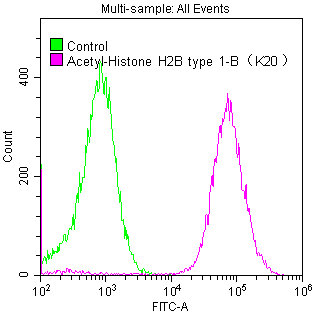 Overlay histogram showing Hela cells stained with CSB-RA010402A20acHU (red line) at 1:50. The cells were fixed with 70% Ethylalcohol (18h) and then permeabilized with 0.3% Triton X-100 for 2 min.The cells were then incubated in 1x PBS /10% normal goat serum to block non-specific protein-protein interactions followed by primary antibody for 1 h at 4℃.The secondary antibody used was FITC goat anti-rabbit IgG (H+L) at 1/200 dilution for 1 h at 4℃. Control antibody (green line) was used under the same conditions. Acquisition of >10,000 events was performed.