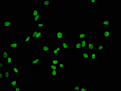 Immunofluorescence staining of Hela cells(treated by 15mM sodium butyrate for 30min) with CSB-RA010402A20acHU at 1:84,counter-stained with DAPI. The cells were fixed in 4% formaldehyde, permeabilized using 0.2% Triton X-100 and blocked in 10% normal Goat Serum. The cells were then incubated with the antibody overnight at 4℃.The secondary antibody was Alexa Fluor 488-congugated AffiniPure Goat Anti-Rabbit IgG (H+L).