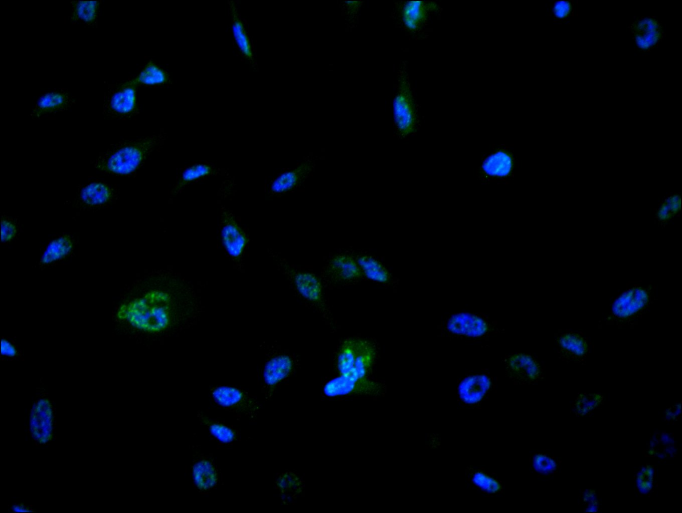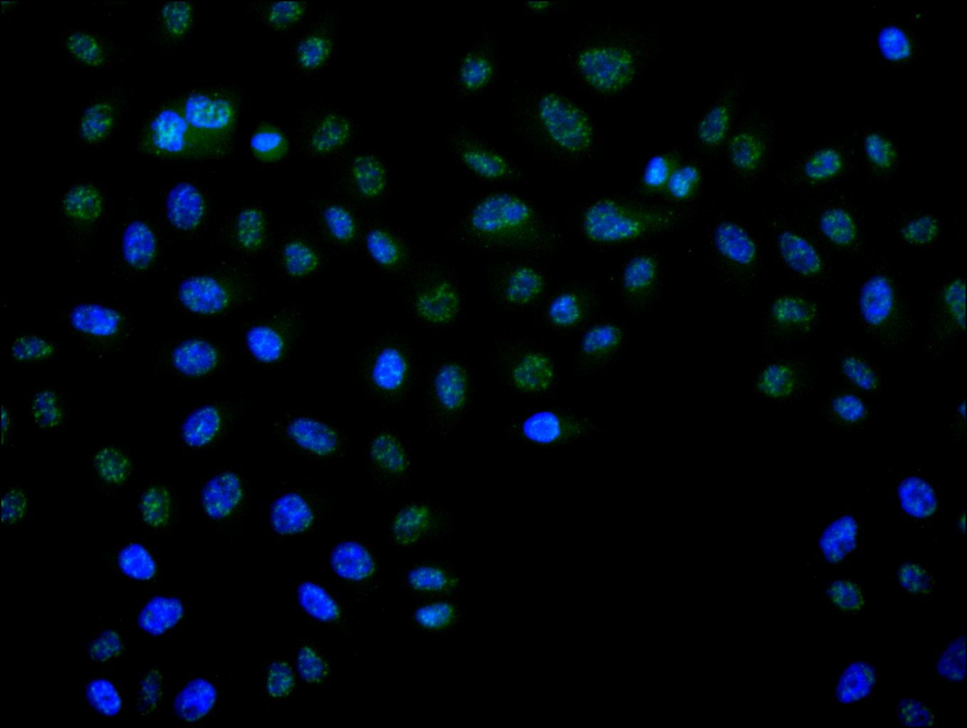Immunofluorescence staining of Hela cell with 5% goat serum, counter-stained with DAPI. The cells were fixed in 4% formaldehyde and blocked in 10% normal Goat Serum. The cells were then incubated with the antibody overnight at 4C. The secondary antibody was Alexa Fluor 488-congugated AffiniPure Goat Anti-Rabbit IgG(H+L).