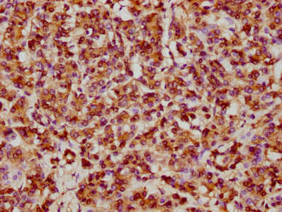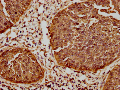 IHC image of CSB-RA010833A0HU diluted at 1:61.9 and staining in paraffin-embedded human cervical cancer performed on a Leica BondTM system. After dewaxing and hydration, antigen retrieval was mediated by high pressure in a citrate buffer (pH 6.0). Section was blocked with 10% normal goat serum 30min at RT. Then primary antibody (1% BSA) was incubated at 4℃ overnight. The primary is detected by a biotinylated secondary antibody and visualized using an HRP conjugated SP system.