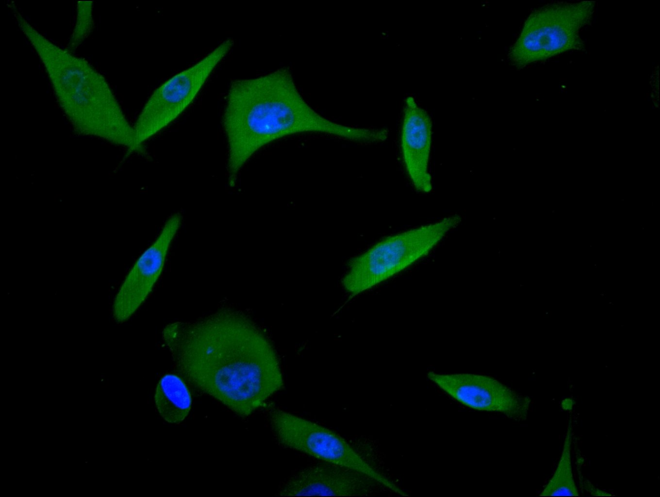 Immunofluorescence staining of Hela cell with 5% goat serum, counter-stained with DAPI. The cells were fixed in 4% formaldehyde and blocked in 10% normal Goat Serum. The cells were then incubated with the antibody overnight at 4C. The secondary antibody was Alexa Fluor 488-congugated AffiniPure Goat Anti-Rabbit IgG(H+L).