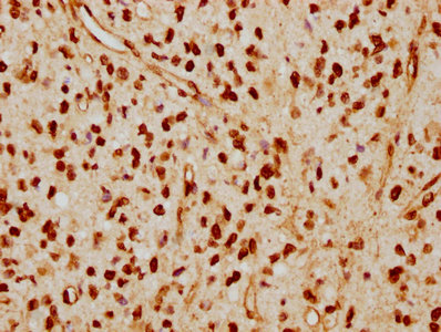 IHC image of CSB-RA013003A0HU diluted at 1:115 and staining in paraffin-embedded human glioma cancer performed on a Leica BondTM system. After dewaxing and hydration, antigen retrieval was mediated by high pressure in a citrate buffer (pH 6.0). Section was blocked with 10% normal goat serum 30min at RT. Then primary antibody (1% BSA) was incubated at 4℃ overnight. The primary is detected by a biotinylated secondary antibody and visualized using an HRP conjugated SP system.