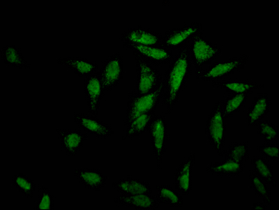 Immunofluorescence staining of Hela Cells with CSB-RA780541A0HU at 1:50, counter-stained with DAPI. The cells were fixed in 4% formaldehyde, permeated by 0.2% TritonX-100, and blocked in 10% normal Goat Serum. The cells were then incubated with the antibody overnight at 4℃. Nuclear DNA was labeled in blue with DAPI. The secondary antibody was FITC-conjugated AffiniPure Goat Anti-Rabbit IgG (H+L).