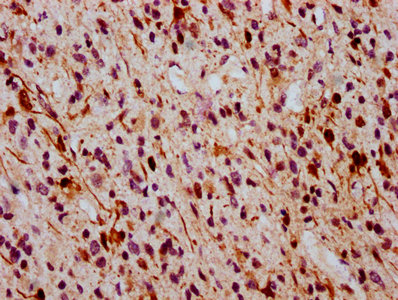 IHC image of CSB-RA013456A185phHU diluted at 1:100 and staining in paraffin-embedded human glioma cancer performed on a Leica BondTM system. After dewaxing and hydration, antigen retrieval was mediated by high pressure in a citrate buffer (pH 6.0). Section was blocked with 10% normal goat serum 30min at RT. Then primary antibody (1% BSA) was incubated at 4℃ overnight. The primary is detected by a biotinylated secondary antibody and visualized using an HRP conjugated SP system.