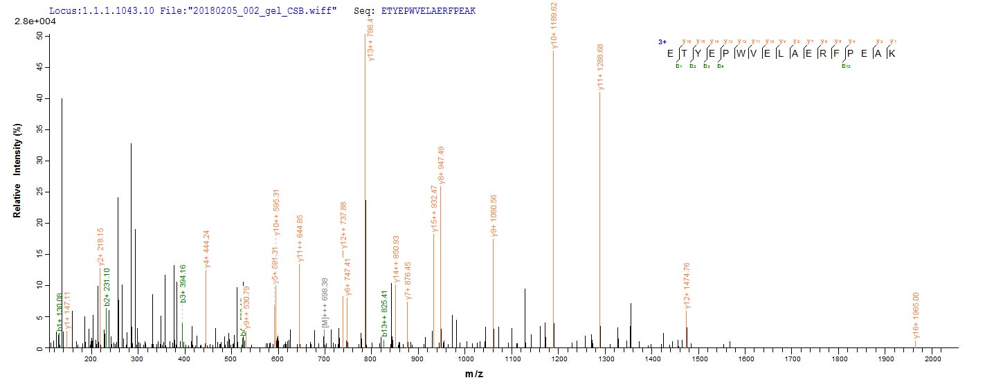 Based on the SEQUEST from database of Yeast host and target protein, the LC-MS/MS Analysis result of CSB-YP526868DOA could indicate that this peptide derived from Yeast-expressed Arabidopsis thaliana (Mouse-ear cress) UGT71C1.