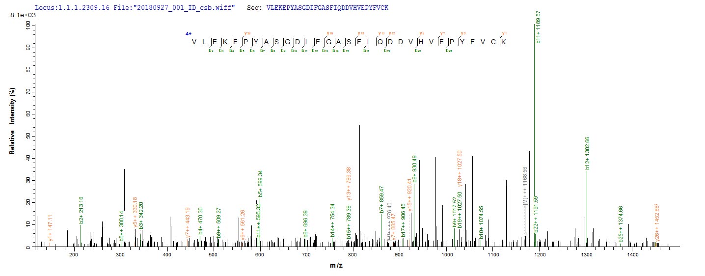 Based on the SEQUEST from database of E.coli host and target protein, the LC-MS/MS Analysis result of CSB-EP521738BRJ could indicate that this peptide derived from E.coli-expressed Bacillus subtilis (strain 168) thiO.