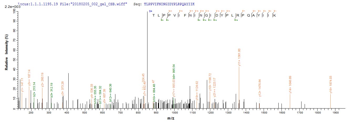 Based on the SEQUEST from database of E.coli host and target protein, the LC-MS/MS Analysis result of CSB-EP637747BO could indicate that this peptide derived from E.coli-expressed Bos taurus (Bovine) PAG2.
