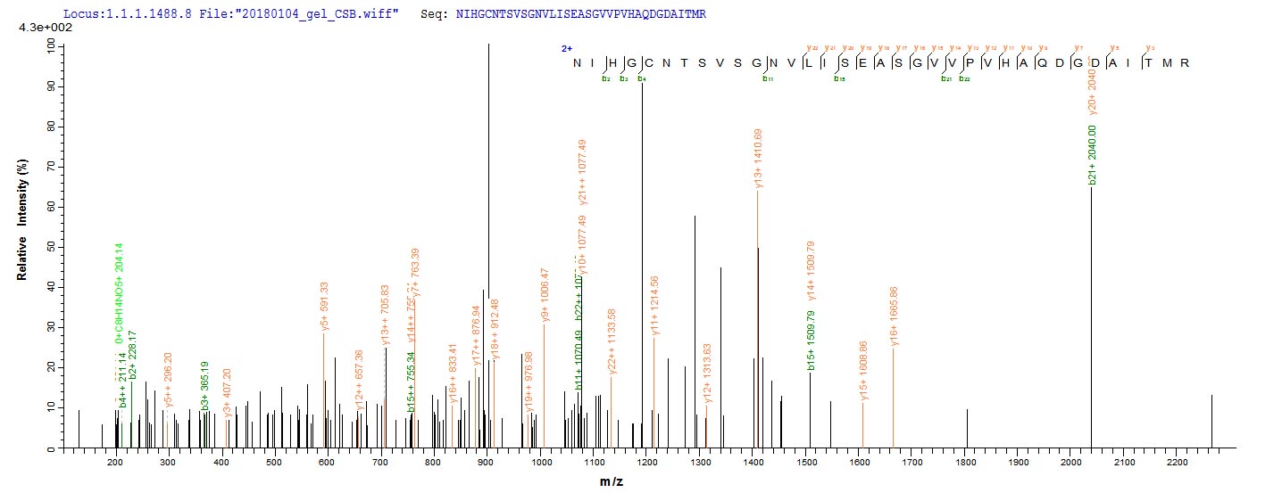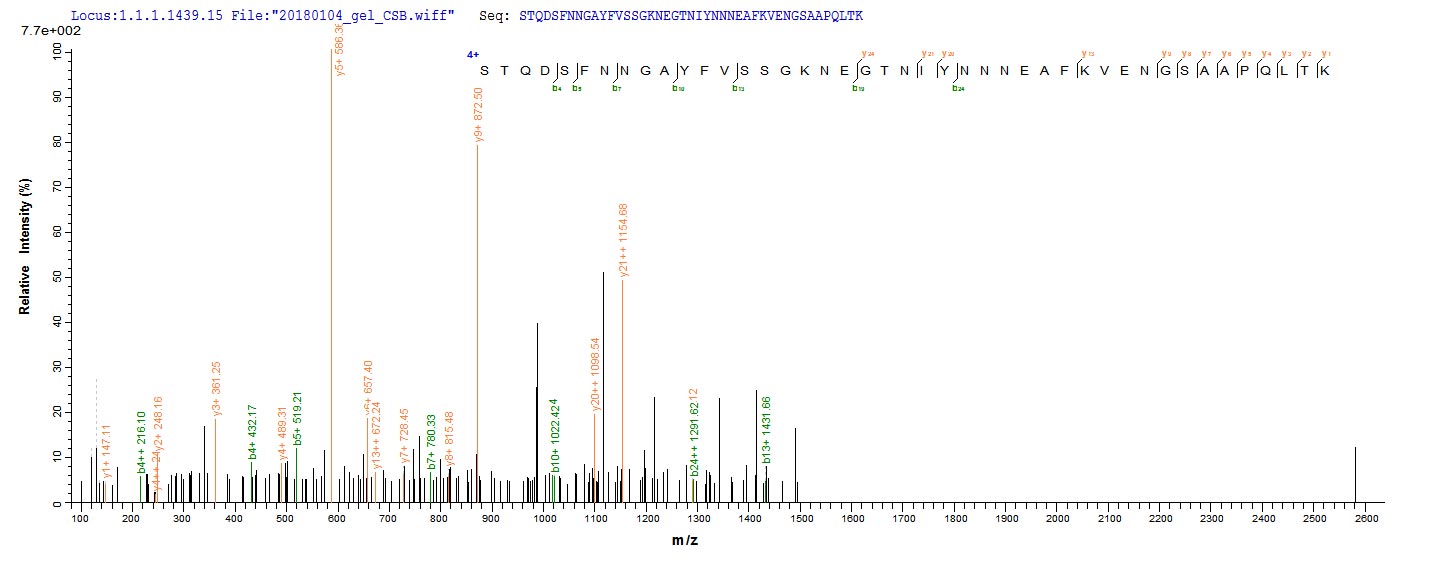 Based on the SEQUEST from database of E.coli host and target protein, the LC-MS/MS Analysis result of CSB-EP856862CHAX could indicate that this peptide derived from E.coli-expressed Chamaecyparis obtusa (Hinoki false-cypress) N/A.