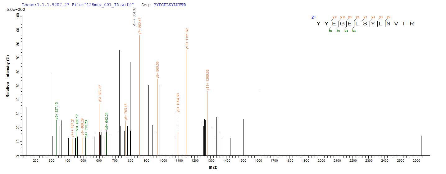 Based on the SEQUEST from database of E.coli host and target protein, the LC-MS/MS Analysis result of CSB-EP006187DXU could indicate that this peptide derived from E.coli-expressed Cricetulus griseus (Chinese hamster) (Cricetulus barabensis griseus) CTSD.