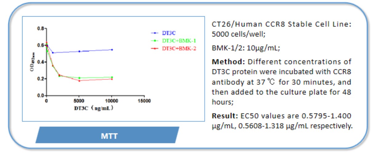 生物活性:①After DT3C 10μg/ml formed complexes with different concentrations of Anti-CCR8 antibodies (CSB-RA004847MA3HU), cytotoxicity experiments were conducted on CHOK1/Human CCR8 cells (CSB-SC004847HU2). The ED50 is 0.3708-0.5608 μg/ml.②After DT3C 10μg/ml formed complexes with different concentrations of Anti-CCR8 antibodies (CSB-RA004847MA3HU), cytotoxicity experiments were conducted on CT26/Human?CCR8?cells?(CSB-SC004847HU3). The ED50 is 0.4661-0.8614 μg/ml.