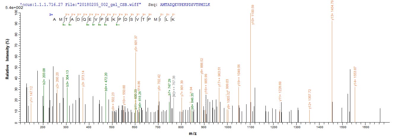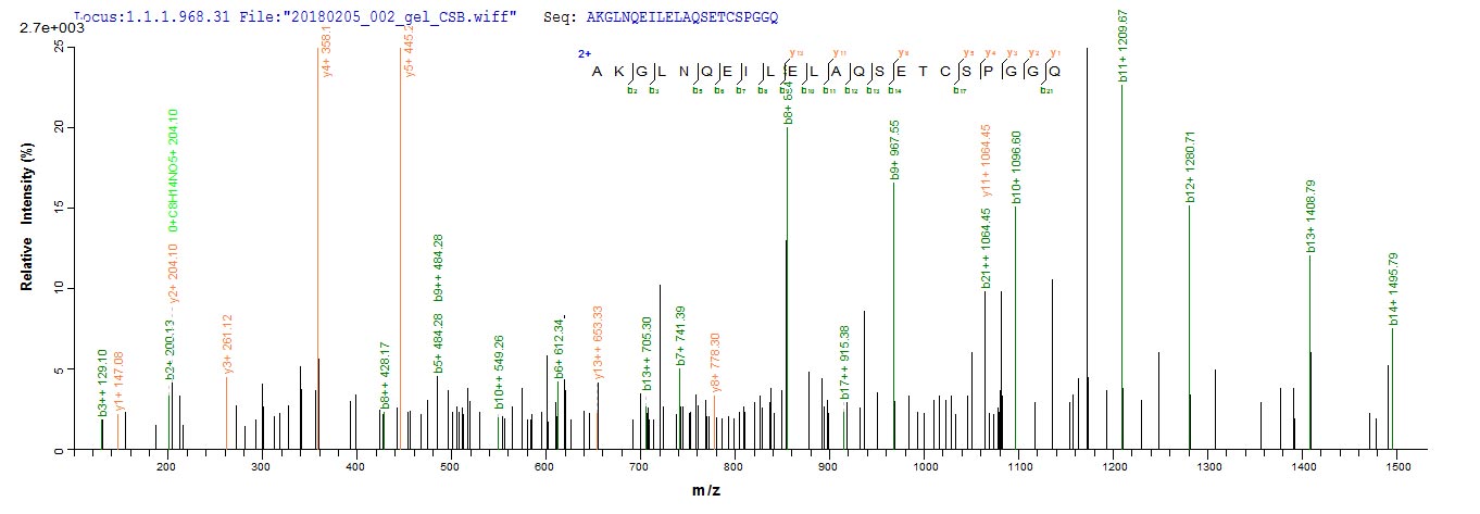 Based on the SEQUEST from database of E.coli host and target protein, the LC-MS/MS Analysis result of CSB-EP519455DO could indicate that this peptide derived from E.coli-expressed Canis familiaris (Dog) (Canis lupus familiaris) N/A.