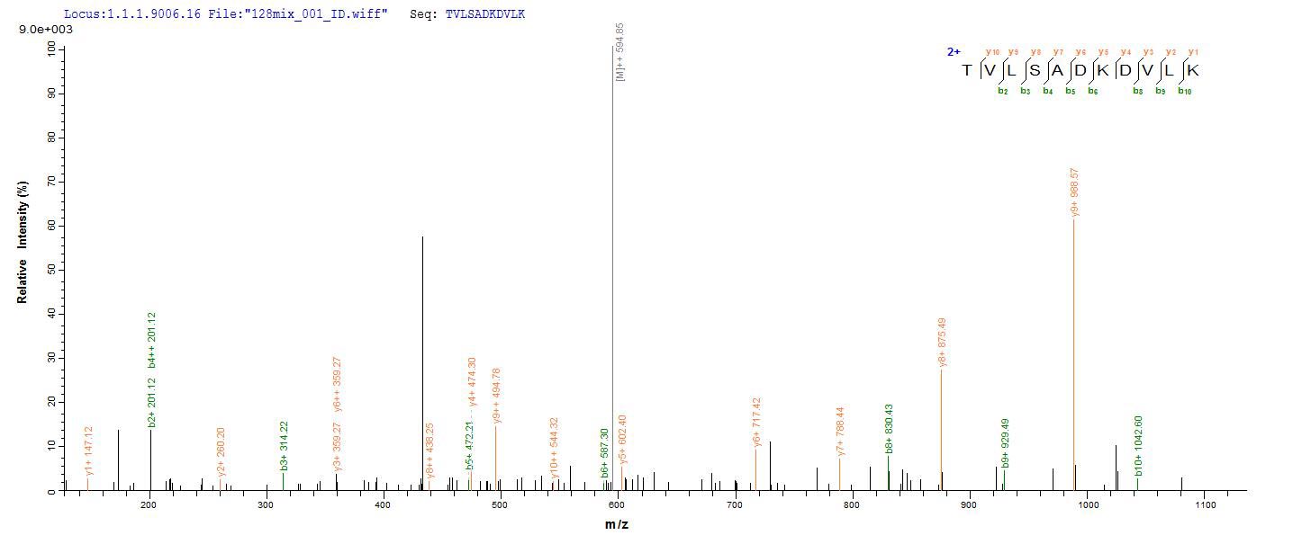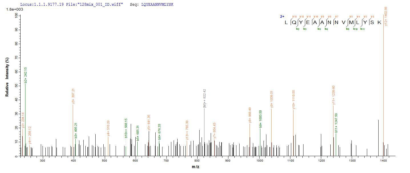 Based on the SEQUEST from database of E.coli host and target protein, the LC-MS/MS Analysis result of CSB-EP366179EDZ could indicate that this peptide derived from E.coli-expressed Enterobacteria phage T4 (Bacteriophage T4) uvsY.
