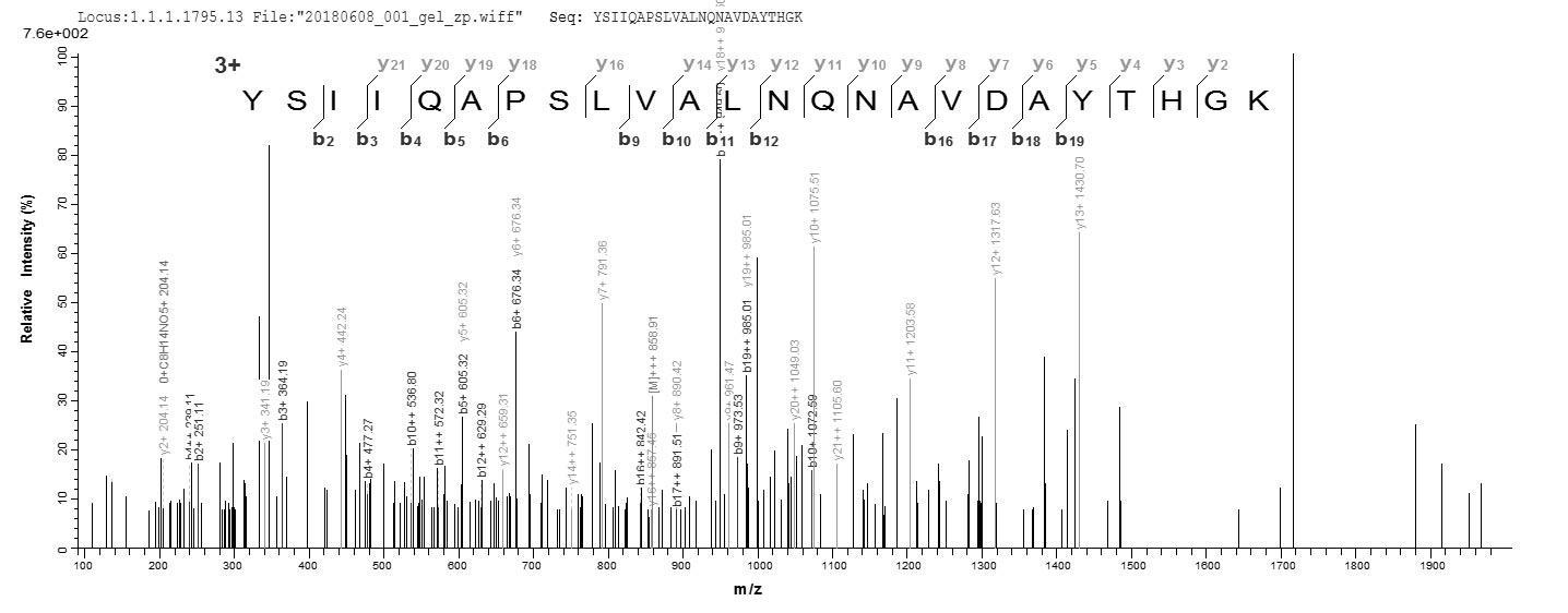 Based on the SEQUEST from database of E.coli host and target protein, the LC-MS/MS Analysis result of CSB-EP769310ELW could indicate that this peptide derived from E.coli-expressed Enterococcus faecalis (strain ATCC 700802 / V583) gelE.