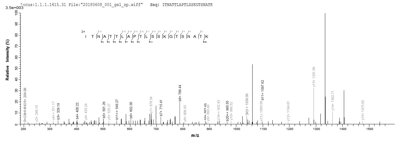 Based on the SEQUEST from database of E.coli host and target protein, the LC-MS/MS Analysis result of CSB-EP365881EFA1 could indicate that this peptide derived from E.coli-expressed Epstein-Barr virus (strain B95-8) (HHV-4) (Human herpesvirus 4) BDLF3.