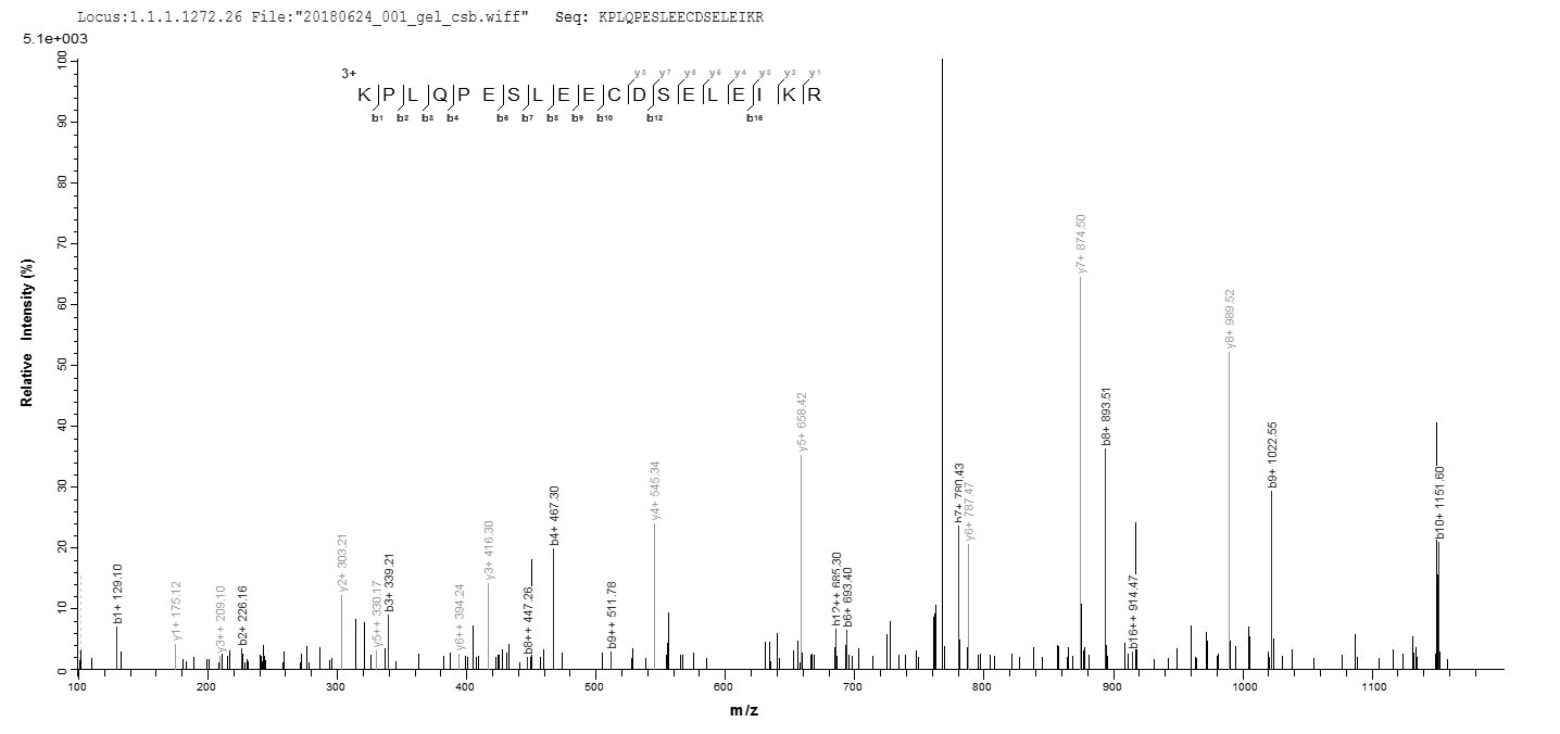 Based on the SEQUEST from database of E.coli host and target protein, the LC-MS/MS Analysis result of CSB-EP668599EFC could indicate that this peptide derived from E.coli-expressed Epstein-Barr virus (strain GD1) (HHV-4) (Human herpesvirus 4) BZLF1.