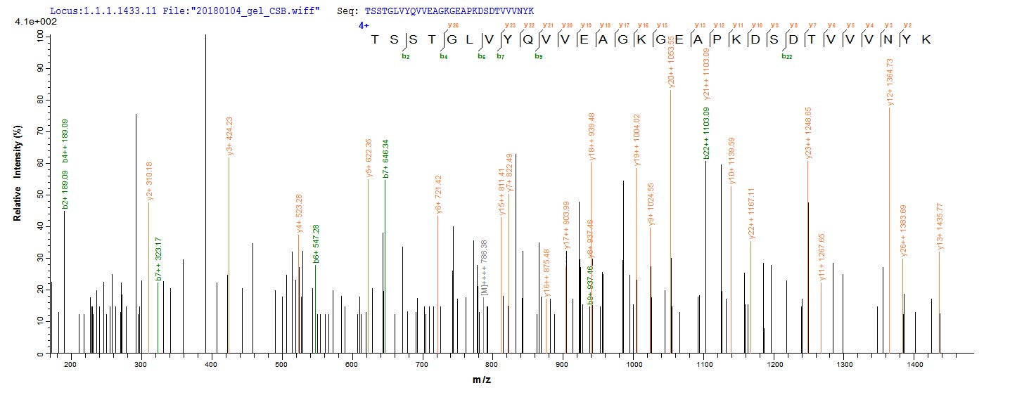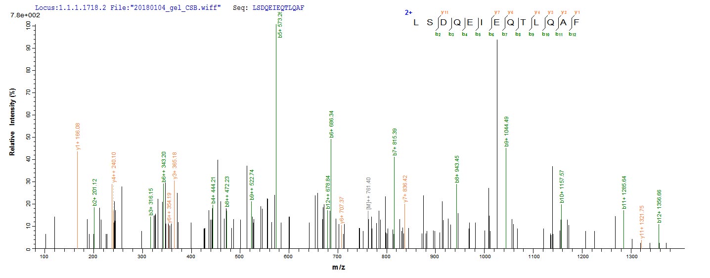 Based on the SEQUEST from database of E.coli host and target protein, the LC-MS/MS Analysis result of CSB-EP355178EGX could indicate that this peptide derived from E.coli-expressed Escherichia coli (strain K12) fkpA.