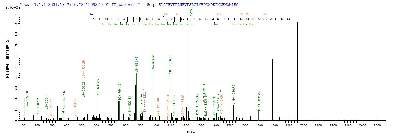Based on the SEQUEST from database of Yeast host and target protein, the LC-MS/MS Analysis result of CSB-YP540419ENT could indicate that this peptide derived from Yeast-expressed Escherichia coli (strain K12) rpiA.