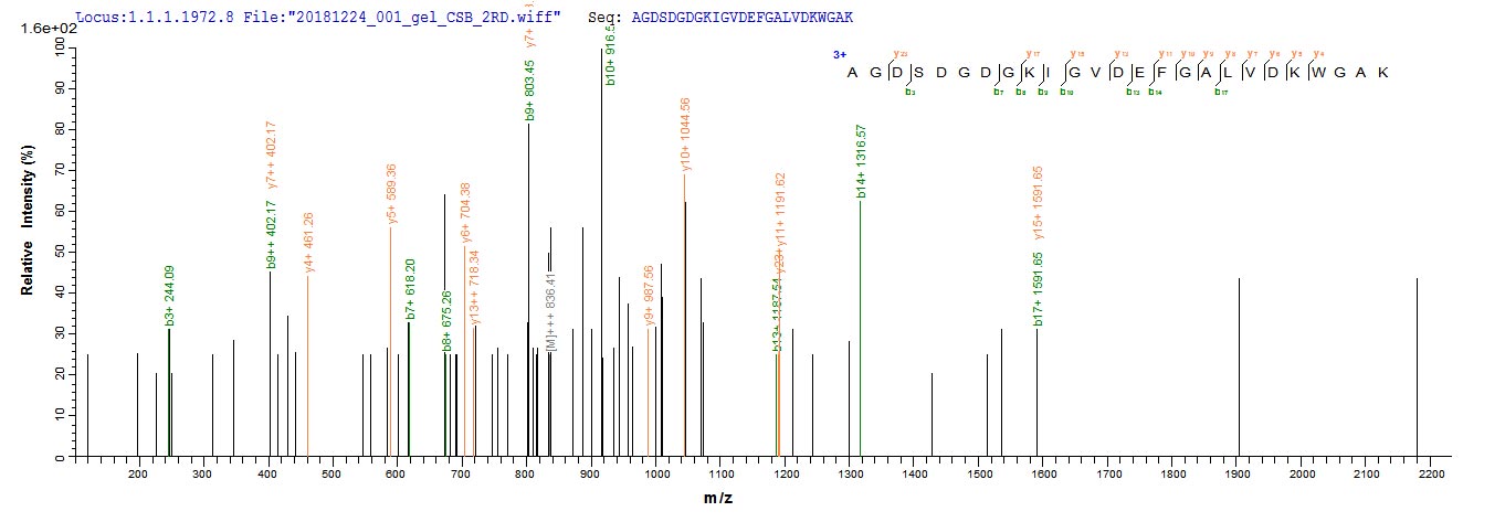 Based on the SEQUEST from database of E.coli host and target protein, the LC-MS/MS Analysis result of CSB-EP365766GAA could indicate that this peptide derived from E.coli-expressed Gadus morhua subsp. callarias (Baltic cod) (Gadus callarias) N/A.