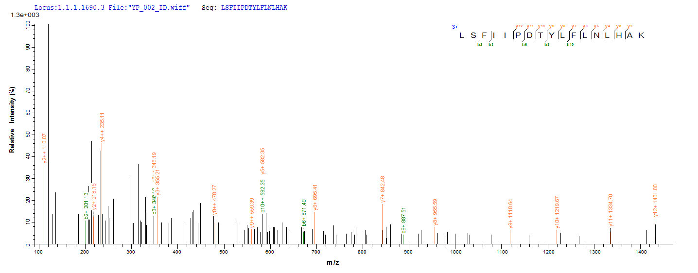 Based on the SEQUEST from database of Yeast host and target protein, the LC-MS/MS Analysis result of CSB-YP333053GHL could indicate that this peptide derived from Yeast-expressed Gardnerella vaginalis 5-1 GV51_0914.
