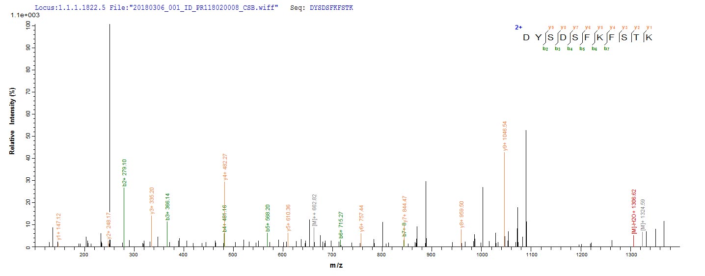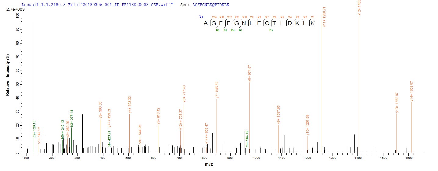 Based on the SEQUEST from database of E.coli host and target protein, the LC-MS/MS Analysis result of CSB-EP301307HUS could indicate that this peptide derived from E.coli-expressed Helicobacter pylori (Campylobacter pylori) cagA.
