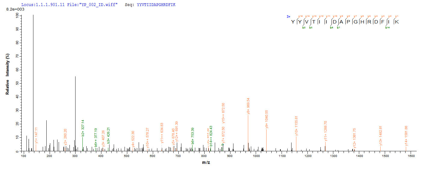 Based on the SEQUEST from database of E.coli host and target protein, the LC-MS/MS Analysis result of CSB-EP007409HU could indicate that this peptide derived from E.coli-expressed Homo sapiens (Human) EEF1A1.