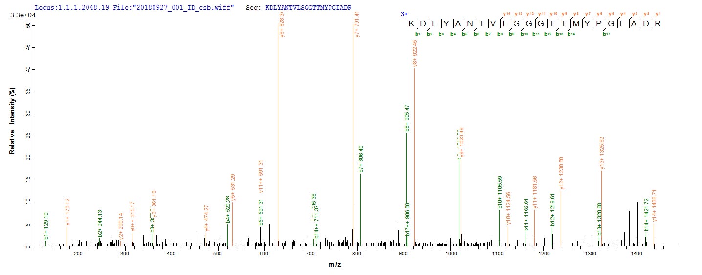 Based on the SEQUEST from database of E.coli host and target protein, the LC-MS/MS Analysis result of CSB-EP001207HU could indicate that this peptide derived from E.coli-expressed Homo sapiens (Human) ACTB.