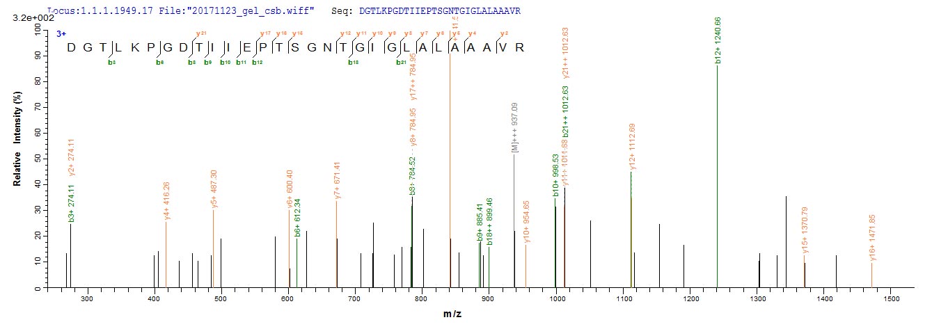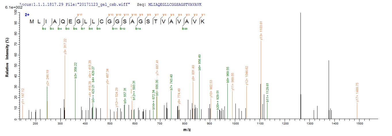Based on the SEQUEST from database of E.coli host and target protein, the LC-MS/MS Analysis result of CSB-EP004589HU could indicate that this peptide derived from E.coli-expressed Homo sapiens (Human) CBS.