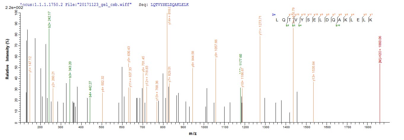 Based on the SEQUEST from database of E.coli host and target protein, the LC-MS/MS Analysis result of CSB-EP866296HU could indicate that this peptide derived from E.coli-expressed Homo sapiens (Human) TRAIP.